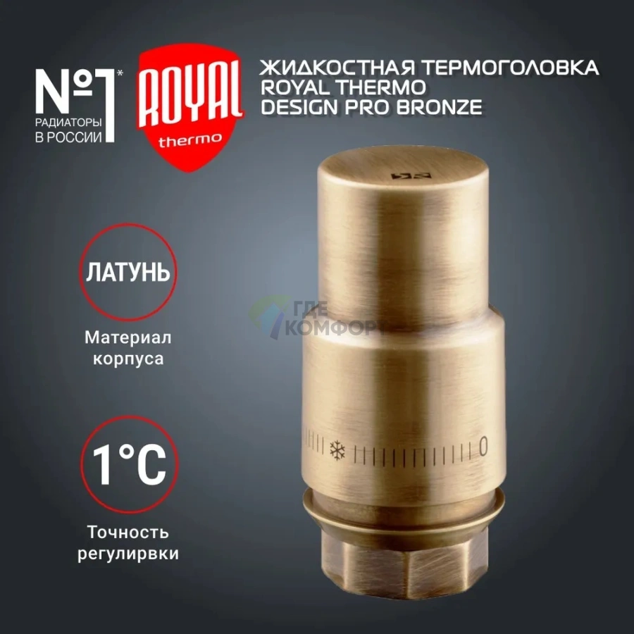 Корпус из качественной бронзы с резьбой М30х1,5 обеспечивает долговечность и устойчивость к теплоносителю. Термоголовка подходит для большинства современных радиаторов, включая модели Royal Thermo, где необходим точный терморегулятор.