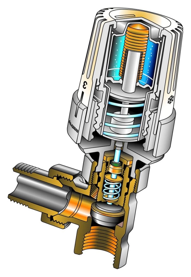 - Встроенный термостатический элемент. Реагирует на изменения температуры в помещении, плавно регулируя поток теплоносителя.