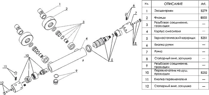 В базовый комплект обычно входит термостатический картридж, лицевая панель с рукоятками, внутренний механизм, декоративная накладка и крепежные элементы. Комплектация может меняться, рекомендуем уточнять у продавца перед покупкой.