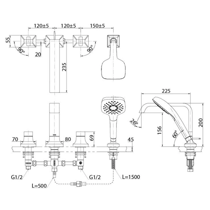 Этот смеситель предназначен для установки в четырёхотверстную систему. Он обеспечивает подачу воды к изливу и ручному душе, управляемую одной рычажной рукояткой.