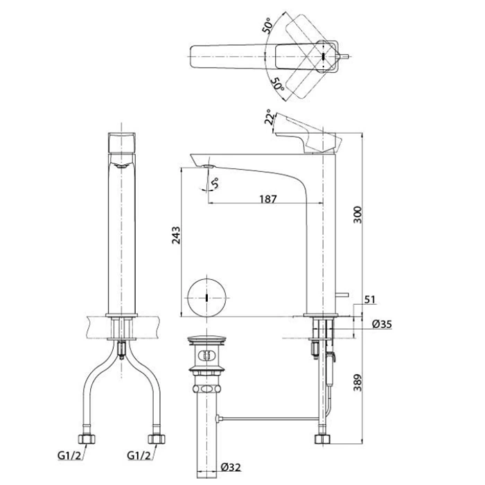 - Универсальный монтаж: смеситель подходит для большинства стандартных раковин с одним или тремя монтажными отверстиями.