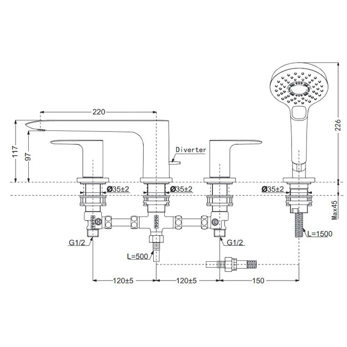 - Основной излив: высокий арочный излив обеспечивает удобное наполнение ванны.