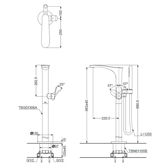 Смеситель для ванны TOTO NC отдельностоящий с ручным душем Active Wave