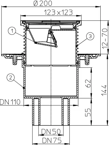 Трап HL310N.2 с решеткой 115x115 мм-незамерзающим затвором и вертикальным выпуском DN50/75/110