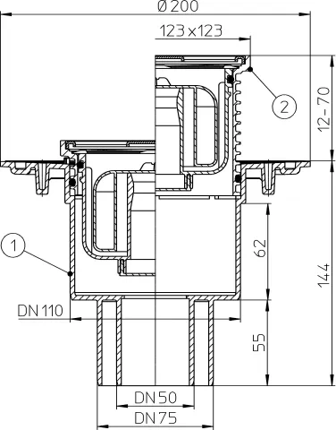- Вертикальный выпуск: Патрубок позволяет выполнять подключение на нескольких уровнях — DN110, DN75 или DN50. Это дает гибкость при проектировании разводки.