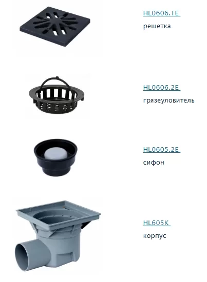 - Комплектация: корпус сифона, грязеуловитель, решетка, уплотнители.