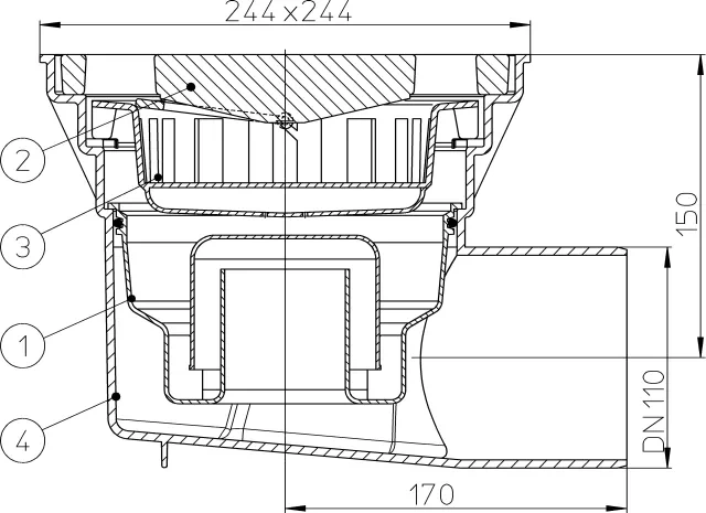 - Диаметр горизонтального выпуска: DN110 мм.