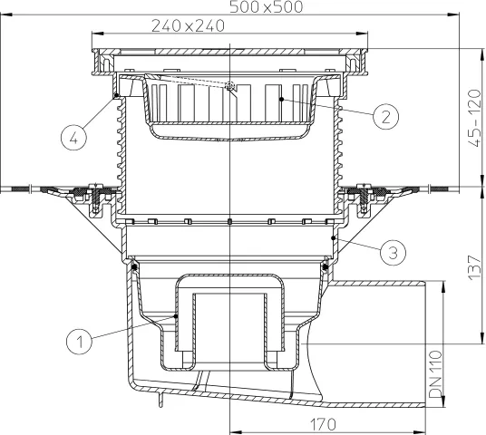 Трап оснащен горизонтальным выпуском DN110, что является стандартом для большинства канализационных систем и упрощает процесс подключения. Универсальная конструкция подходит для различных типов напольных покрытий.