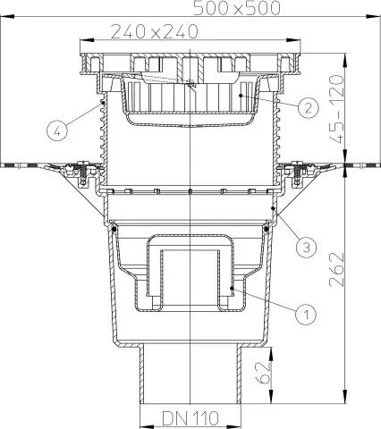Трап HL616HSW 226x226 мм с решеткой, грязеуловителем и вертикальным выпуском DN110