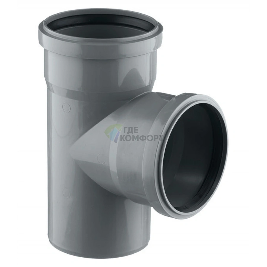 - Точный угол 90°. Литая конструкция из серого ПВХ гарантирует строгий геометрический угол ответвления. Это упрощает монтаж согласно проекту и предотвращает образование засоров из-за неправильного уклона.