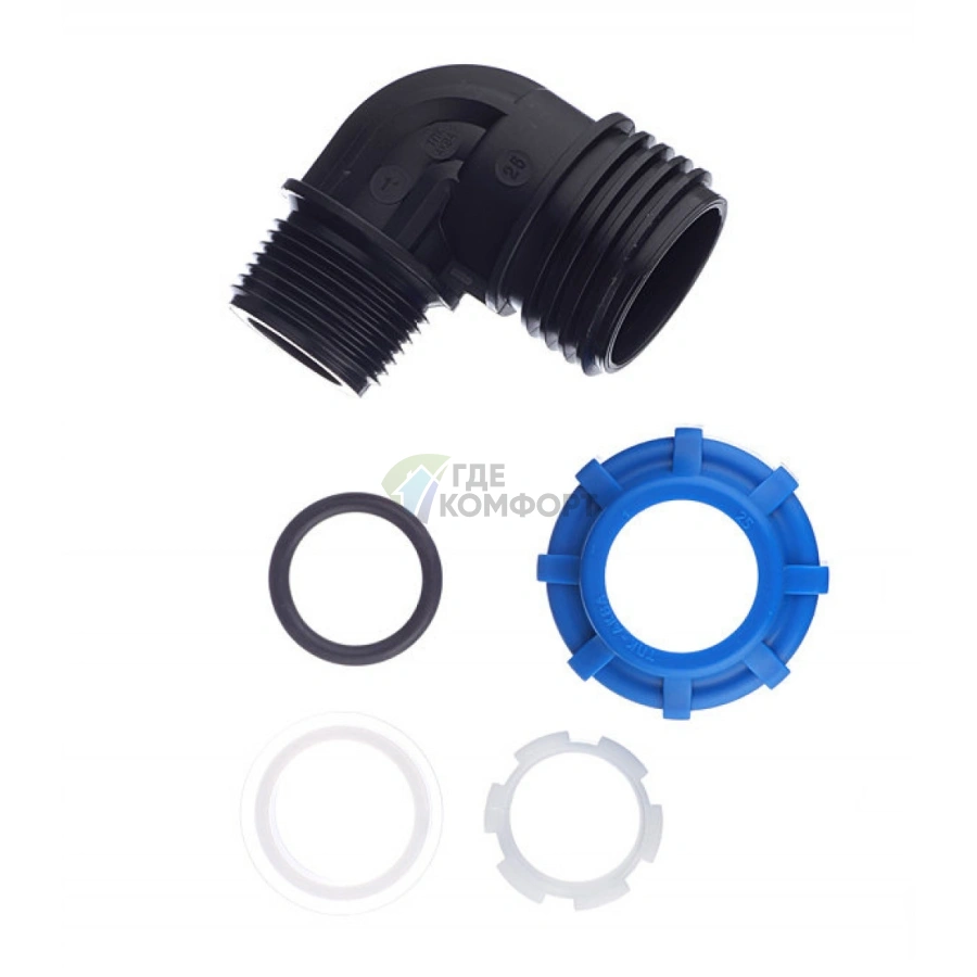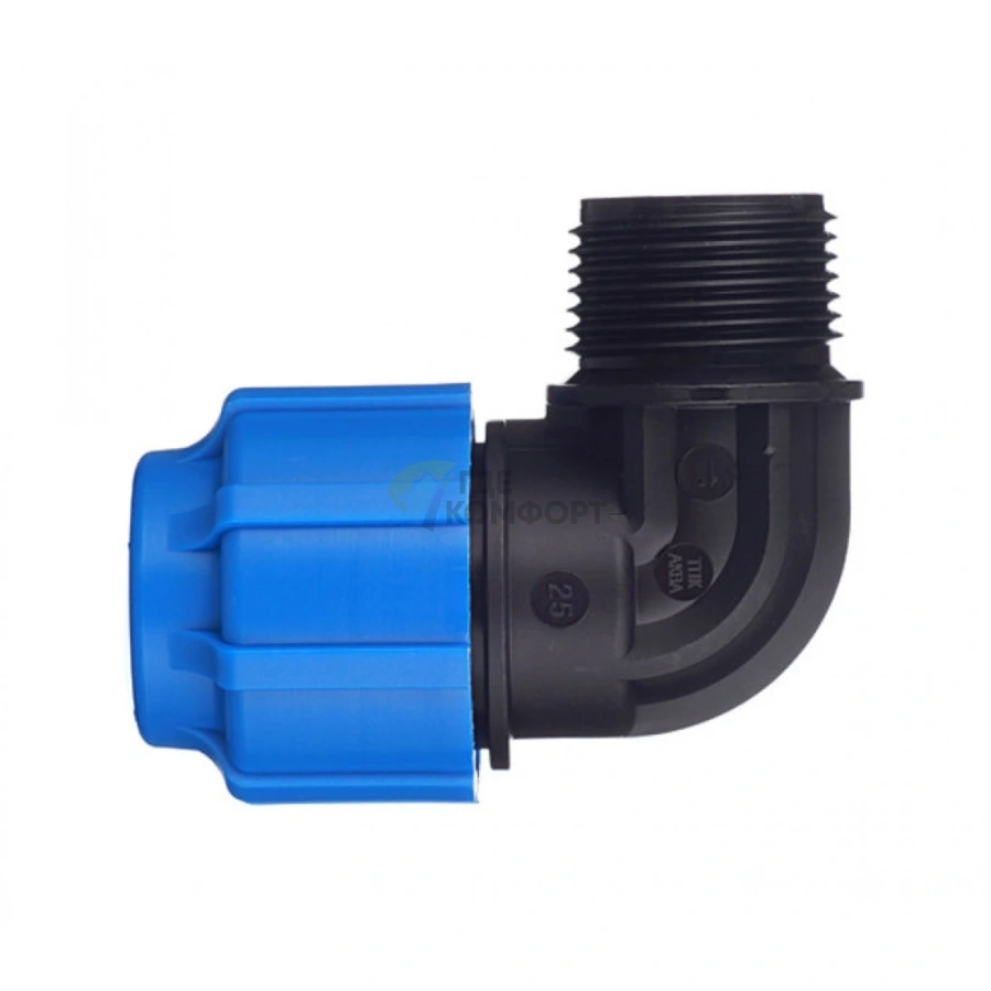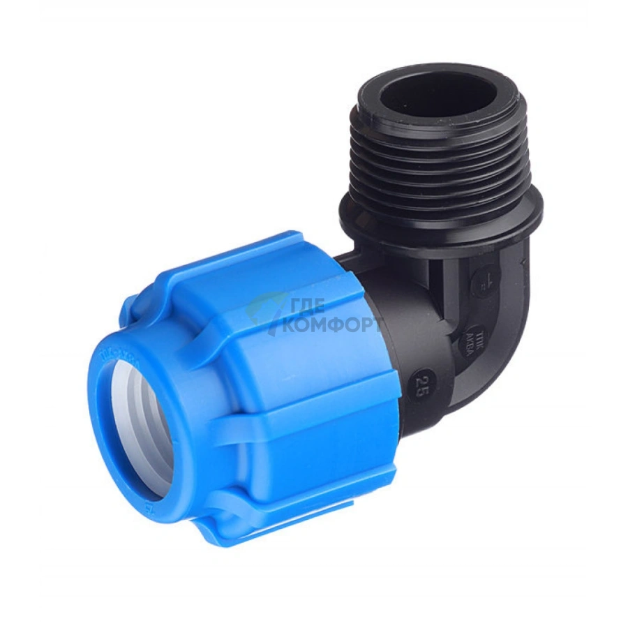 Изделие представляет собой уголок 90 градусов, где с одной стороны находится компрессионное соединение для трубы ПНД диаметром 25 мм, а с другой - наружная резьба типа 1 дюйм. Такая конструкция позволяет легко стыковать полиэтиленовый трубопровод со стандартной металлической арматурой, счетчиками или оборудованием.