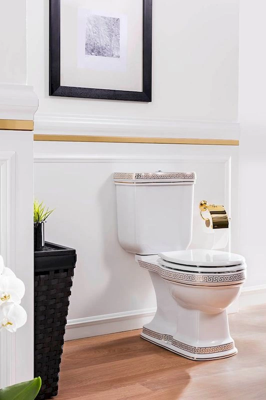 Унитаз изготовлен из высококачественного санфарфора, который отличается высокой прочностью, гигиеничностью и гладкой поверхностью. Декоративные элементы выполнены с покрытием «Золото Версаче».