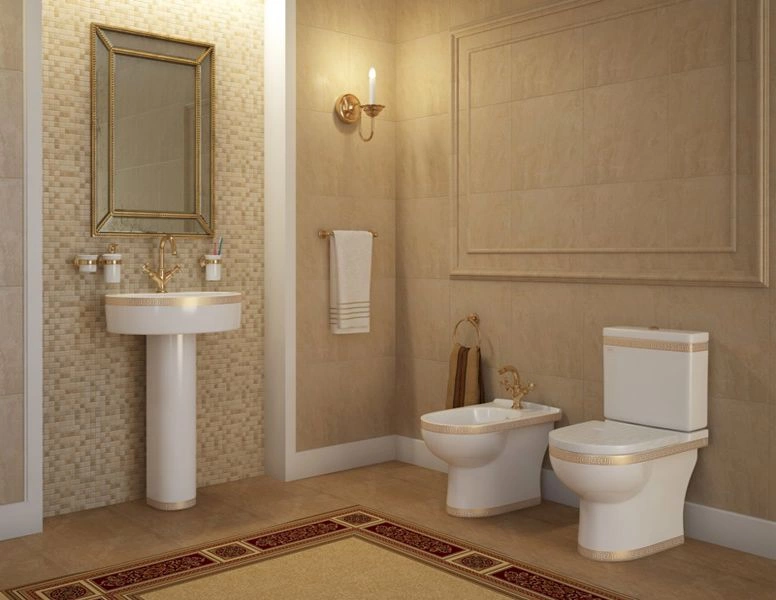 Декоративное покрытие «Золото Версаче» наносится по технологии устойчивого напыления, устойчивого к бытовой химии. Система «Римская полка» — это цельная конструкция без зазоров между бачком и чашей, что предотвращает скопление пыли и грязи.