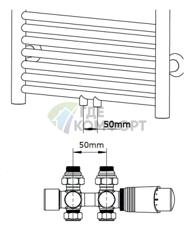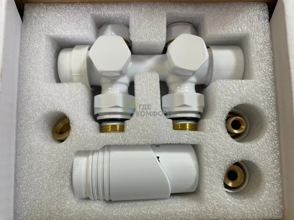 - Экономия места: все элементы собраны в одном блоке для нижнего подключения, что упрощает монтаж за радиатором.