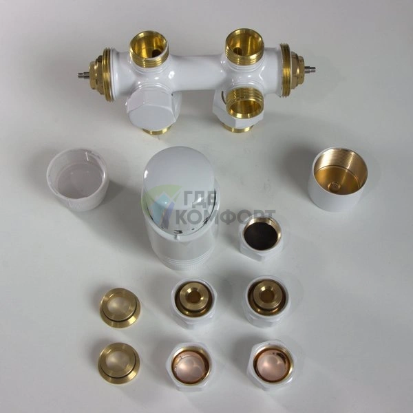 Узел изготовлен из никелированной латуни и поставляется в готовом к монтажу виде. В комплекте два шаровых крана для отсечки и два отвода для подключения к трубопроводу. Термоголовка с присоединением М30x1.5 обеспечивает плавную и точную регулировку температуры в комнате.