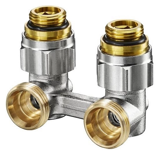 Модель 1015884 с угловым исполнением и размерами 1/2 AG x 3/4 AG создана для скрытого подсоединения радиатора к трубам, выходящим из пола. Его ключевое отличие — интегрированный запорно-регулирующий клапан с предварительной настройкой, позволяющий балансировать систему отопления.