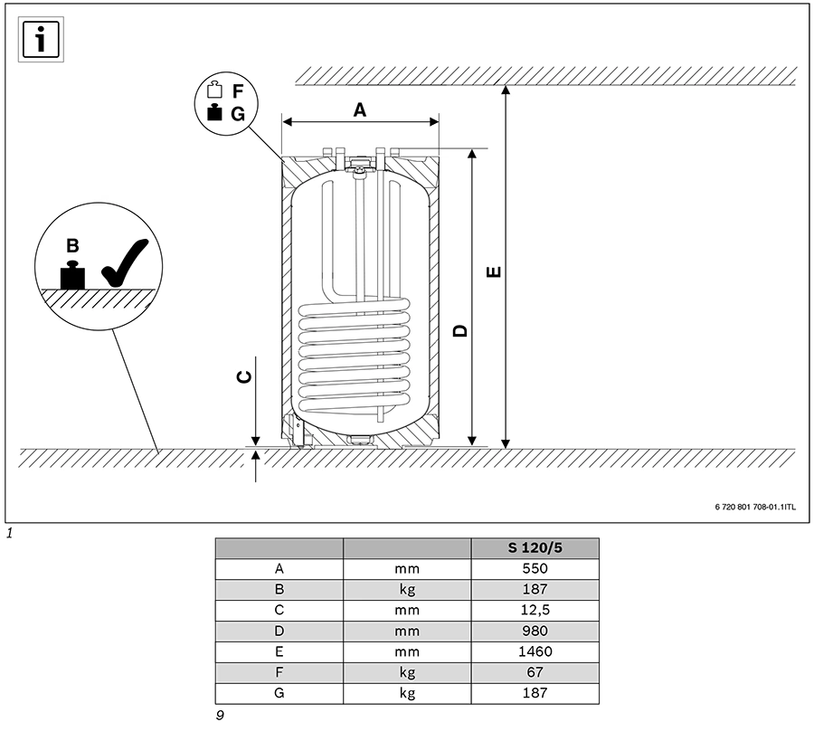 Водонагреватель косвенного нагрева Logalux S120/5 выделяется регулируемыми ножками для установки на неровные поверхности и верхним расположением патрубков для удобного монтажа. Совместим с настенными котлами Buderus серий Logamax U152/U154 и GB172/GB162, что позволяет создавать компактные котельные установки.