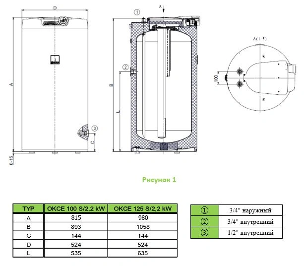 - Способ нагрева: основной — косвенный (от котла), резервный — электрический ТЭН на 2 кВт.