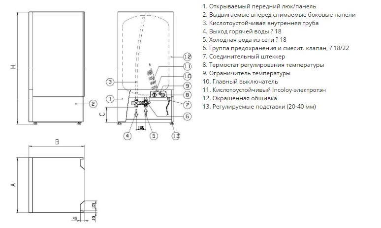 - Внутренний бак: Изготовлен из стали с биостеклофарфоровым покрытием, усиленным титаном, для защиты от коррозии и накипи.