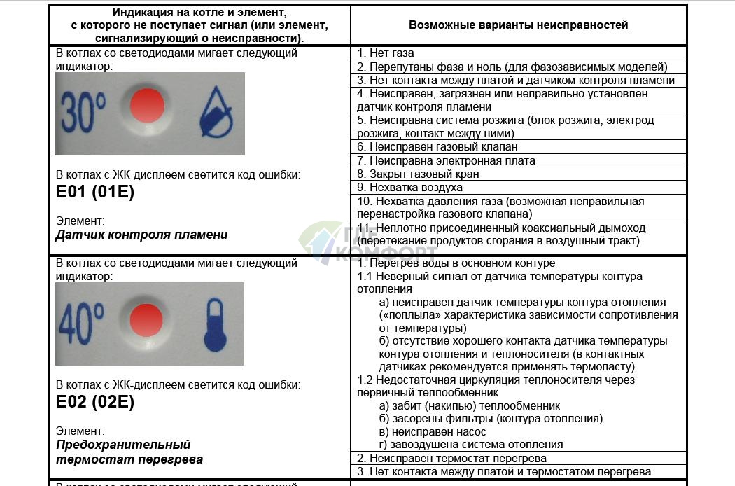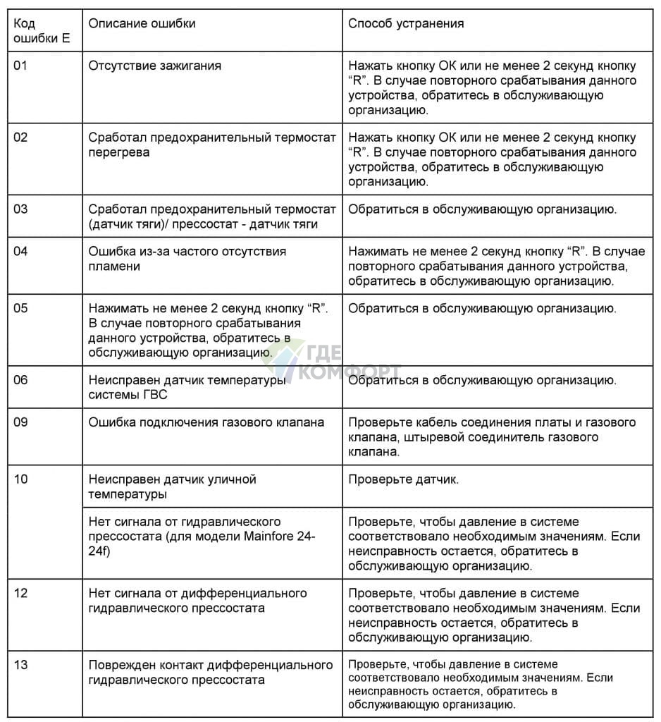 Код E02 указывает на срабатывание предохранительного термостата из-за перегрева. Код E03 может означать как срабатывание датчика перегрева, так и ошибку конфигурации платы управления [[5], [7]].
